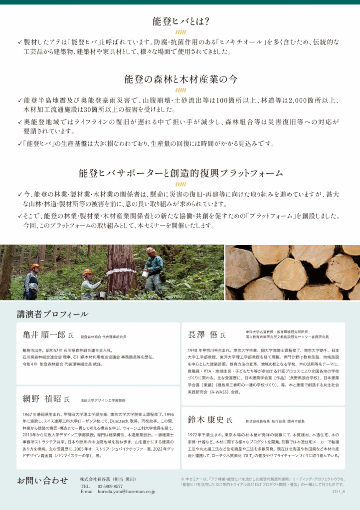 - 共催 :アテ林業・能登ヒバを活かした能登の創造的復興プラットフォーム(ATE-NET)、(株)長谷萬