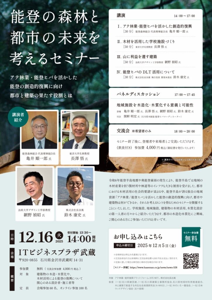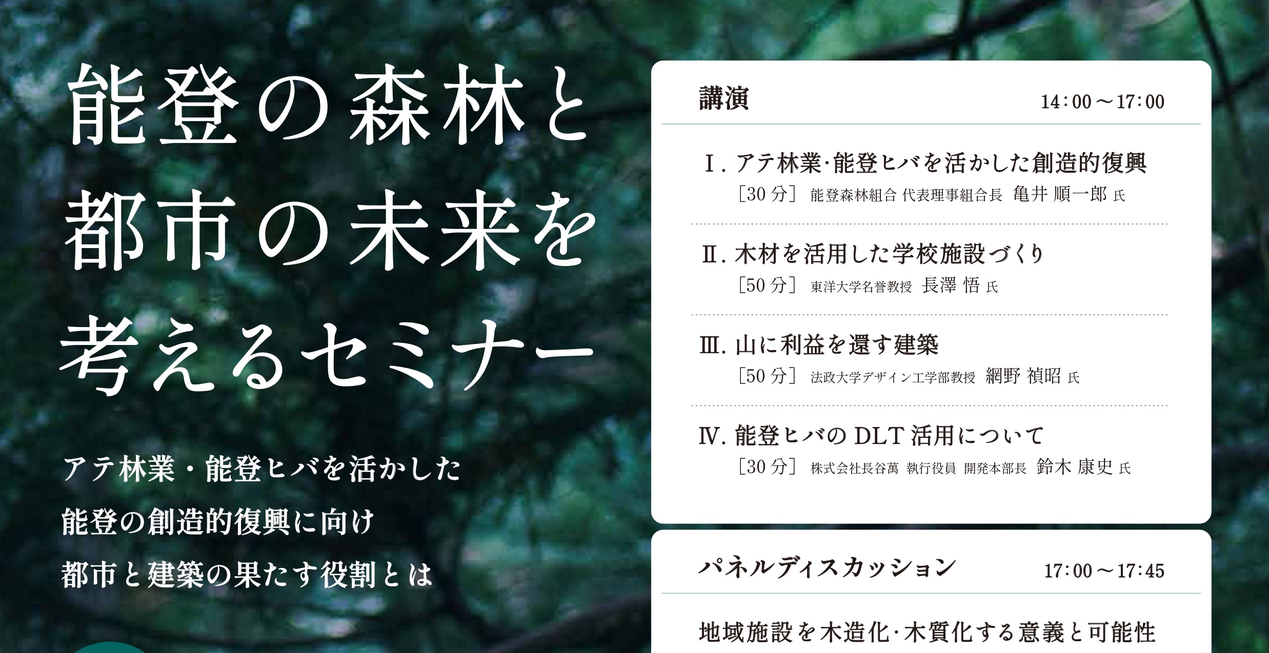 - 能登半島の森林、木材産業の再生につながる、「アテ林業/能登ヒバ」を活かした創造的復興に向けて、能登の森林に都市や都市の建築物は何ができるか、それらを考える機運醸成のきっかけづくりとして、「アテ林業・能登ヒバを活かした能登の創造的復興プラットフォーム(ATE-NET)」と能登ヒバサポーターの(株)長谷萬との共催で、主に建築物の設計や施工に関わる方々を対象として、学識経験者及び実務者に登壇頂くセミナーを開催いたします。