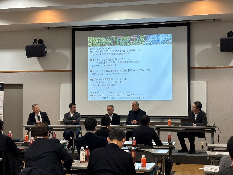 「まちと山を結ぶ共創の学校づくり:長澤悟教授」、「ヨーロッパの木造建築から学ぶ山と社会のつなぎ方:網野禎昭教授(法政大学デザイン工学部教授)」、「アテ林業・能登ヒバを活かした能登の創造的復興:亀井組合長」、「能登ヒバDLTの活用について:鈴木康史(株式会社長谷萬)」という講演と、関軒明宏さま(石川県木材産業振興協会 能登ヒバコーディネーター)を司会として招聘し、登壇者含む5名によるパネルディスカッションを行いました。