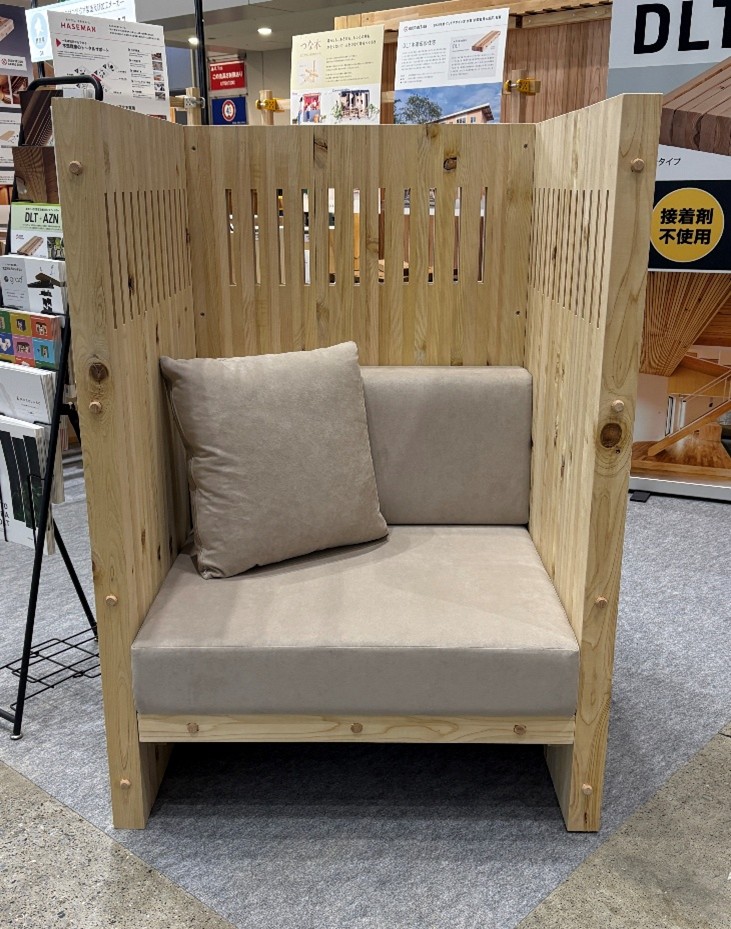 半個室型ラウンジチェアとナイトテーブルを能登ヒバDLTで製作しました。WOODコレクション(モクコレ)2026、国際ホテルレストランショーに展示し、多くの方々に家具を体験していただきました。