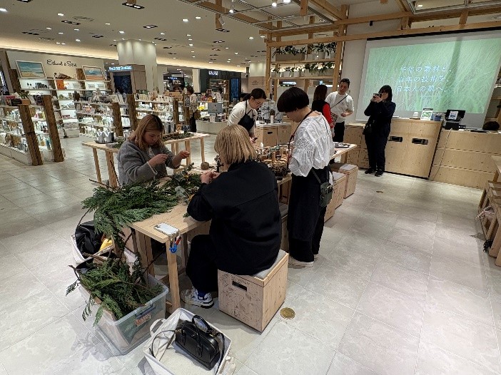 本事業では、都市部において能登ヒバを活用した体験型ワークショップ(スワッグ制作、ヒバチップ詰め放題、バスソルト調合)を実施し、「参加型・体験型」を軸としたマーケティング手法を検証しました。