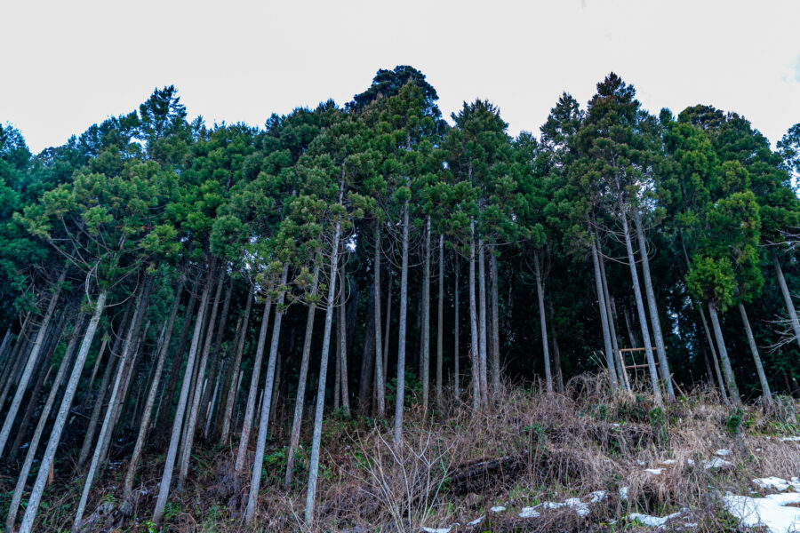 昔は、木を一本切れば家族が1か月暮らしていけるほどの収入になりましたが、いま林業だけで食べていくのは本当に厳しいのが現実です。皆さん、山は自然のものだから放置しておいても大丈夫だと思うでしょう? しかし、そうではありません。人の手でつくられた森は、放置したらどんどん黒くなっていきます。ひょろりとまっすぐ伸びたあの木々は、節ができぬよう人の手で間伐したもので、こうして手入れを続けないと地面の草花が枯れ、保水力が保てず、地崩れを起こしてしまいます。