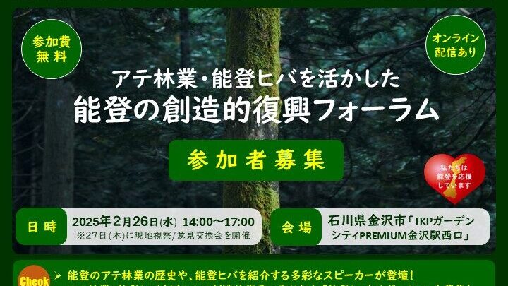 令和7年2月26日(水)に石川県木材産業振興協会と能登森林組合の主催により「アテ林業・能登ヒバを活かした能登の創造的復興フォーラム」が開催。翌27日(木)には奥能登地域での現地視察・意見交換会も実施され、森林・林業・木材産業に関わる多様な参加者が集いました。